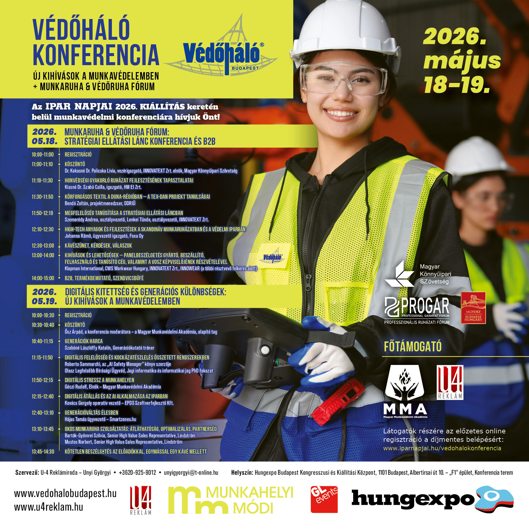 Várjuk szíves jelentkezését résztvevőként a Védőháló Budapest Konferenciára 2026. május 15.-ig. A részvétel ingyenes, de regisztrációhoz kötött. Jelentkezni a Hungexpo weboldalán keresztül az alábbi linken lehet 2026. április 15-től: https://iparnapjai.hu/vedohalokonferencia/